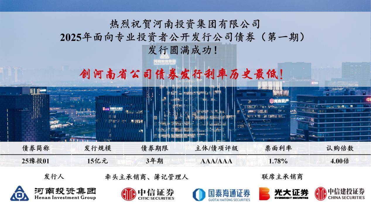 【大河财立方 记者 杨萨】9月18日,河南投资集团有限公司(以下简称河南投资集团)发行2025年第1期公司债券华泰国际,发行规模15亿元,期限3年,票面利率1.78%,获4倍认购。本期债券创河南省有史以来公司债最低发行利率。