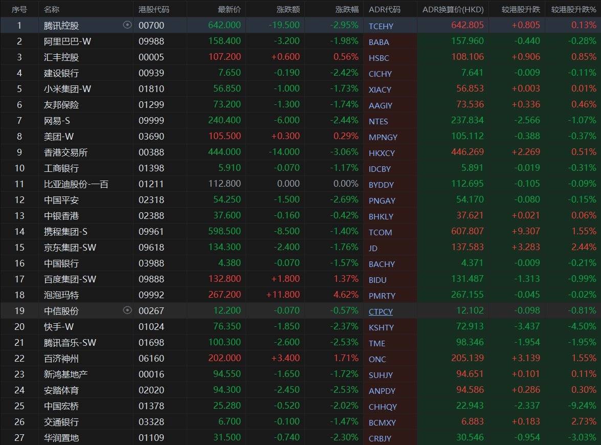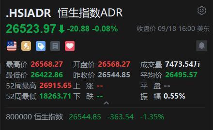 智通财经APP获悉信汇网,周四,美股三大指数集体上涨,恒生指数ADR下跌,按比例计算,收报26523.97点,较香港收市下跌20.88点或0.08%。
