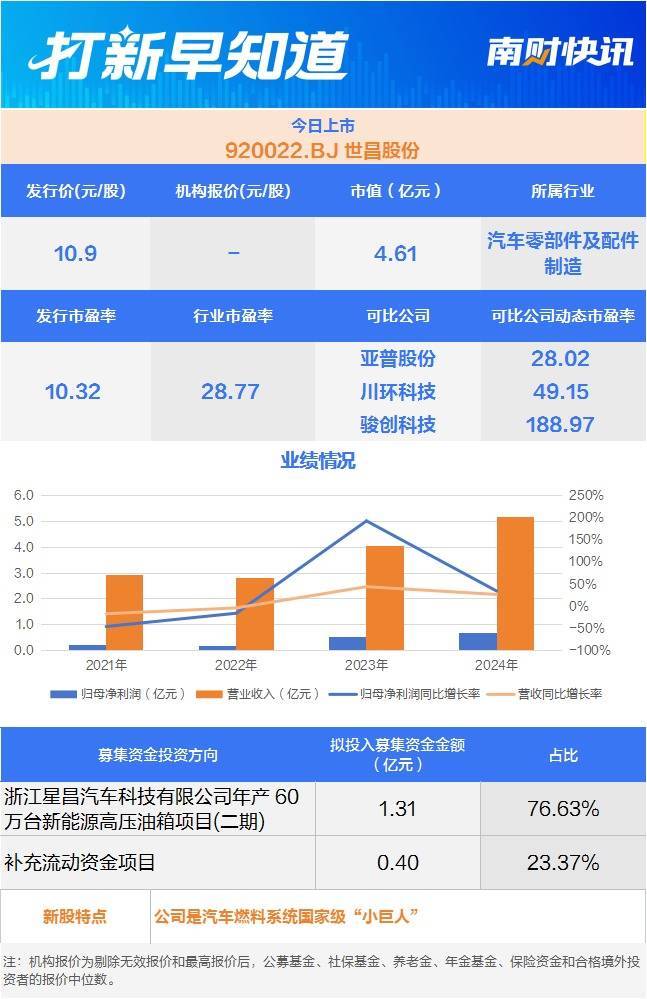 世昌股份(920022.BJ)将于北交所挂牌。公司成立于2006年,主营业务为汽车燃料系统的研发、生产和销售,主要产品为汽车塑料燃油箱总成,是国家级重点汽车燃料系统专业级生产制造商。